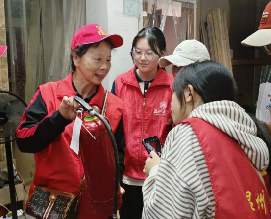 抵达“海霞妈妈”总部后,同学们在几位“海霞妈妈”们的带领下,分成了四个小组,亲身践行“做一天海霞妈妈”的志愿服务,开展清理环境、进行交通引导、督促食品安全及寻访消防安全隐患等服务。在实践行动中,女大学生们用心体验着“海霞妈妈”们日常的工作内容,也切身感受着其中的艰辛与不易。志愿服务结束后,大家还围在“温州好人”王银玉队长身旁,聆听她讲述关于“海霞妈妈”的感人故事。在讲到所获荣誉和在疫情时期为社会做出的奉献时,王银玉队长脸上始终洋溢着自信骄傲的笑容,她身体里迸发出来的女性力量,感染着在场的每一位青年。