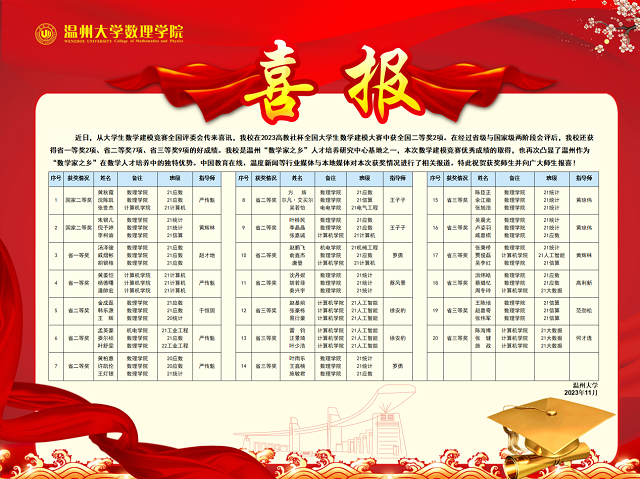 日前,从大学生数学建模竞赛全国评委会传来喜讯,杏吧 在2023高教社杯全国大学生数学建模大赛中获全国二等奖2项。在经过省级与国家级两阶段会评后,除以上2项全国二等奖,杏吧 还获得省一等奖2项、省二等奖7项、省三等奖9项的好成绩。