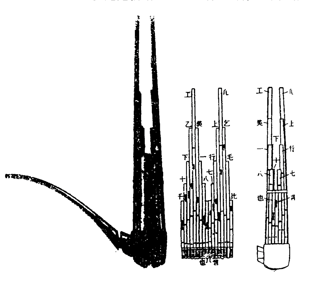 日本正仓院藏十七簧紫竹笙,云为“唐笙”也唯其笙管上所标写的谱字(非日本所谓“唐乐”谱字,实已流为笙管长矩、“铲字”规格的标号)及这些谱字所表示的绝对音高,是可以与“唐代”之“唐”挂得起来的。但是,也正是这些谱字标号,则更进一步证明了正仓院藏的这攒笙不是唐代之笙。