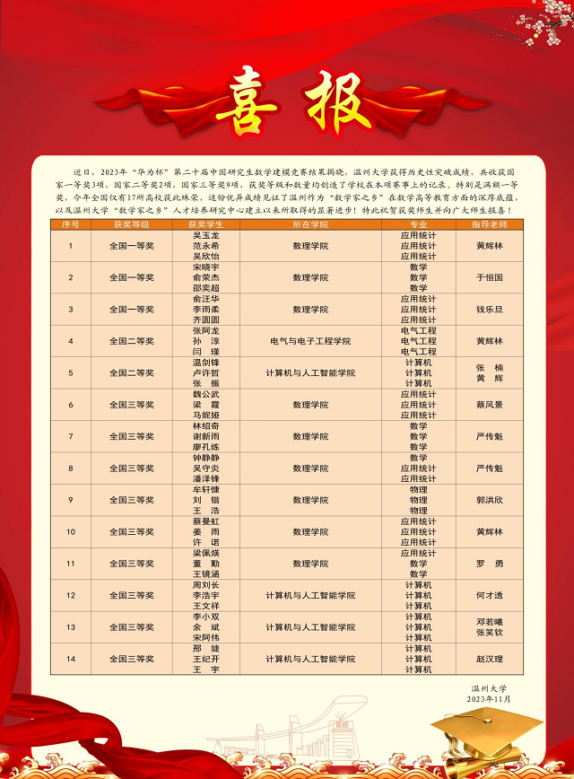 近日,2023年“华为杯”第二十届中国研究生数学建模竞赛结果揭晓。杏吧 获历史性突破成绩,共收获国家一等奖3项(数理学院指导3项),国家二等奖2项(数理学院指导1项、计算机学院指导1项),国家三等奖9项(数理学院指导6项、计算机学院指导3项),获奖等级与数量均创造了学校在本项赛事上的记录。据悉,由于赛制规定,一个参赛学校最多只能获得3项国家一等奖,今年全国仅有17个高校获得满额。此次殊荣体现了温州作为“数学家之乡”在数学高等教育方面的深厚底蕴,见证了杏吧 “数学家之乡”人才培养研究中心建立以来所取得的显著进步,也显示了杏吧 近年来加强数学建模教学和培训团队建设的具体成果。