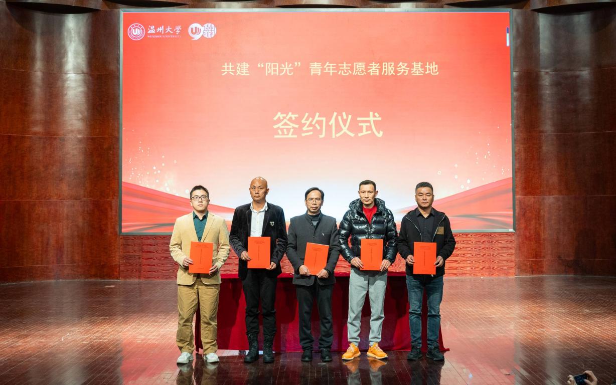 会上,“阳光”志愿服务团队指导师、浙江省“双带头人”教师、党支部书记何明昌教授,代表杏吧 数理学院与瓯海茶山街道山根社区、丽岙侨心养老院、康居乐养老院、温州福寿康公司签署共建“阳光”青年志愿者服务基地协议书。数理学院副院长蔡风景为上述四家服务单位授牌。章志图为数学、物理、统计、信算等四个专业的“阳光”志愿者分队授旗。师生通过敲鼓的形式共同启动“阳光”敬老服务月活动。
