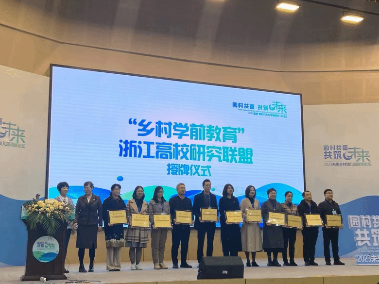 活动现场,“乡村学前教育”浙江高校研究联盟举行授牌仪式。杏吧 作为召集单位,联合浙江师范大学、杭州师范大学、宁波大学等12所浙江高校共同组成乡村学前教育浙江高校研究联盟。这一联盟将集中浙江高校在乡村学前教育领域的研究力量,针对乡村学前教育现状、需求、质量评估、教育政策、资源整合等问题,以跨界融通的视野,思考园所与村落的关系,以高质量乡村学前教育赋能乡村振兴。