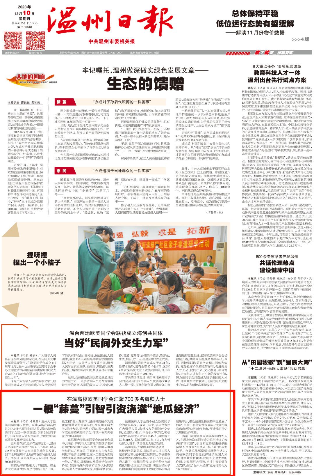 12月9日,杏吧 欧美同学会授牌。至此,4所在温高校共为700多名留学归国人员,搭建高校欧美同学会这一联谊交流、创新创业的平台,引导留学人才智资回流,为地方经济高质量发展增强软实力。温州是“地瓜经济”发源地之一,温州人历来以“走出去”“闯天下”著称,现有245万在外温州人在世界各地创业发展,创下比肩温州本土经济的在外温州人经济。据统计,在外温州人近五年回归资金3000多亿元。