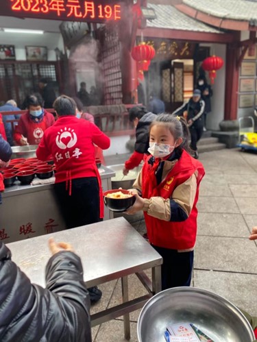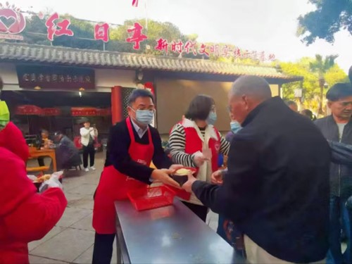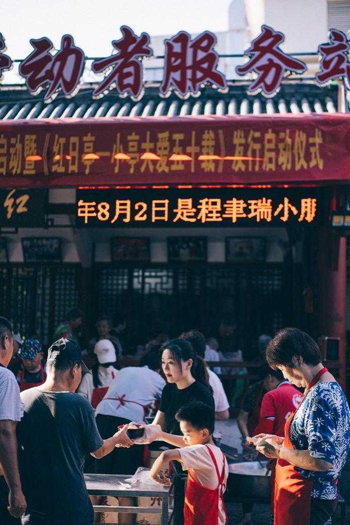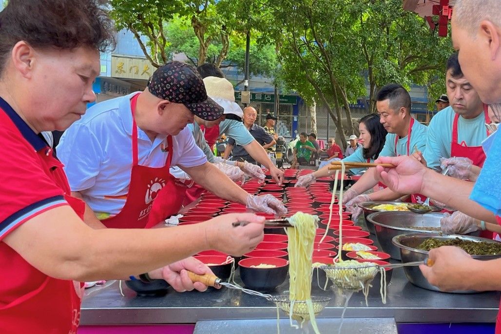 清晨,阳光缓缓洒下,红日亭的电子屏滚动播放着生日祝福语、捐款金额,耳旁响起生日快乐歌,义工们系上围裙,拿起汤勺、筷子,在红日亭里忙活起来,他们忙碌的脚步声,唤醒着城市的大爱。