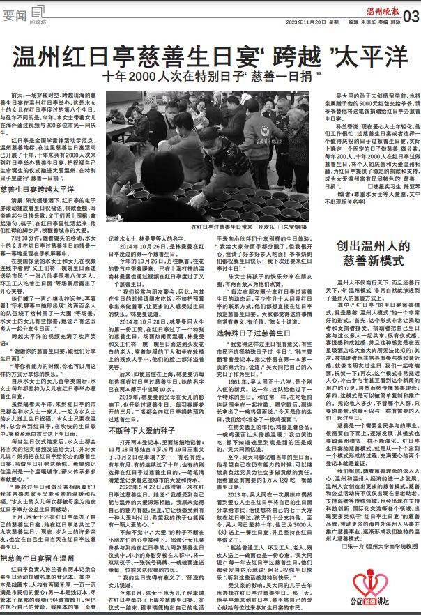 红日亭是全国学雷锋活动示范点、温州慈善地标,在这里慈善生日宴活动已开展了十年,十年来共有2000人次来到红日亭举办慈善生日宴,把祝福自己生命诞生的仪式融进大爱温州,在特别日子里进行“慈善一日捐”。