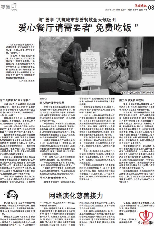 首先,从慈善地点来看,从最传统遍及温州的夏季伏茶,到固定地点的红日亭等“善亭”,再到分布大街小巷的爱心餐厅;其次,从慈善方式来看,从“重公益”到“轻公益”,从伏茶到“慈善早餐”,再到“爱心中晚餐”,温州人实现了善事的多系到、全天候分布,形成了一个慈善网络;再次,以慈善的主体来看,从老人群体到社会大众、温南企业,慈善网络的节点也一直在演化。