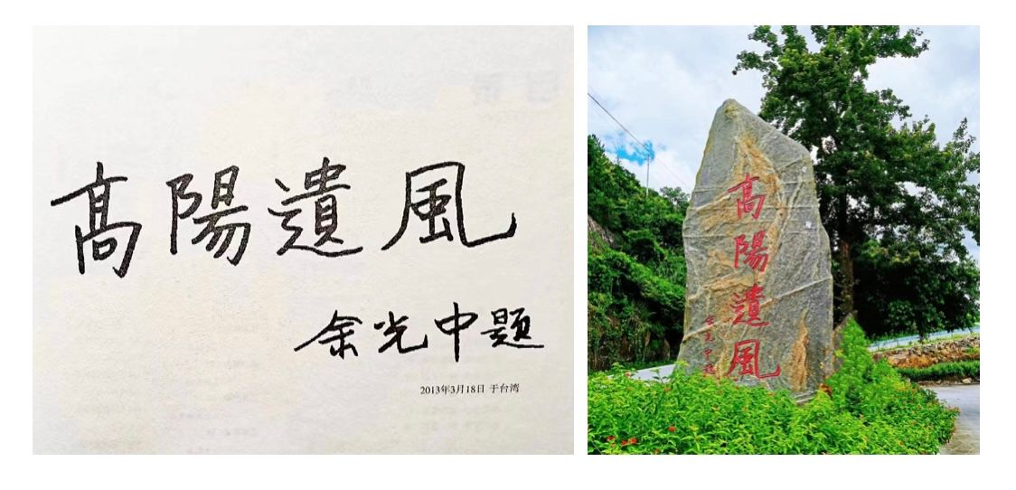 一榕一枫两棵风水树,暗合温州方言“顺风”之意。台湾余光中先生的“高阳遗风”和大陆余秋雨先生的“浙南余氏孝山村”紧贴着“风帆石”的手心手背,海峡两岸两位文化大师悄然“墨”契小村大嶂。