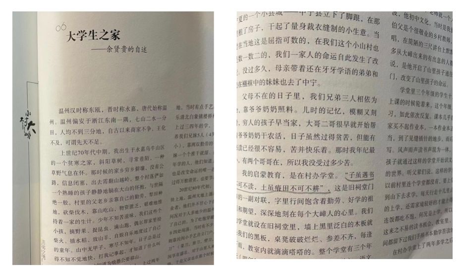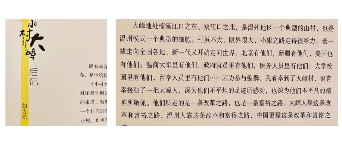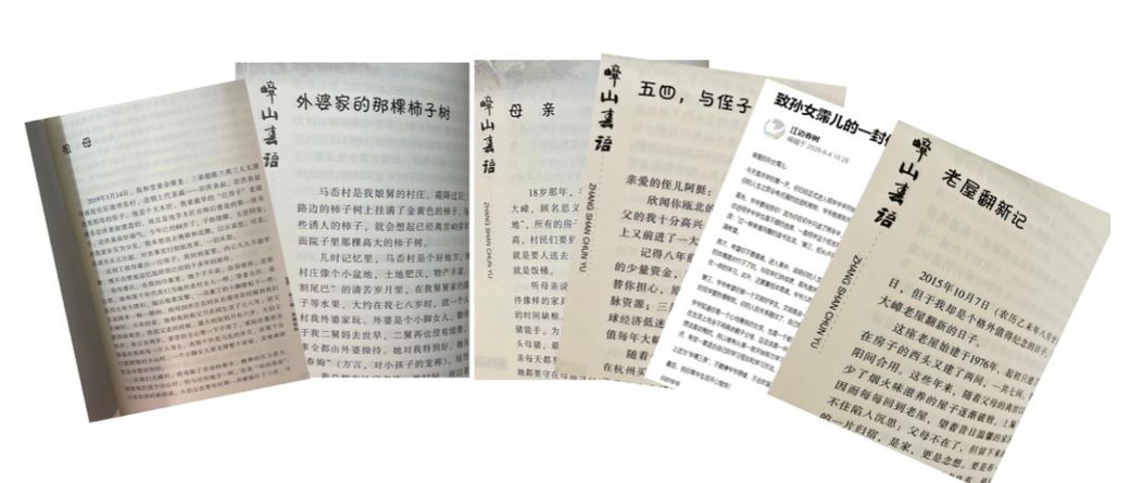 耕读文明在大嶂代代相传,如今的大嶂子弟以“知识改变命运,读书挖掉穷根,高考离开大山,奋斗点亮人生”为奋斗信条,而这也正是哲春先生当年走出大山的精神动力。哲春先生铭记母亲的话:“我伲山上人,是靠干来吃的。”“我们山里人只有读书才会有出息”,他靠读书走出大山,跳出“农门”,端上铁饭碗,由执教到从政,县委办副主任、县报老总、广电掌门,痴情的还属笔墨文章,他与文友相亲相敬,“村书”中《与良心有个约会?》的黄传会,《一次难忘的文学分享》的张翎,《陈酿,是陈珊珊》的陈珊珊,《初识落樱》的落樱,《跨越时空的相会》的林肃,《砥砺前行,方可致远》的傅建国。为拜会黄传会、林曦明、余鹏翔他竟专程“北上广”。他说“我的一生中,遇到两种老师:坐在课堂上教我读书的是属于看得见的老师,电台和报社的编辑是属于看不见的老师。”和第一个约稿他的温州人民广播电台“看不见”的林肃老师三十年后终相见,平生第一束太阳花送给永嘉报老同事、网红作家陈珊珊。