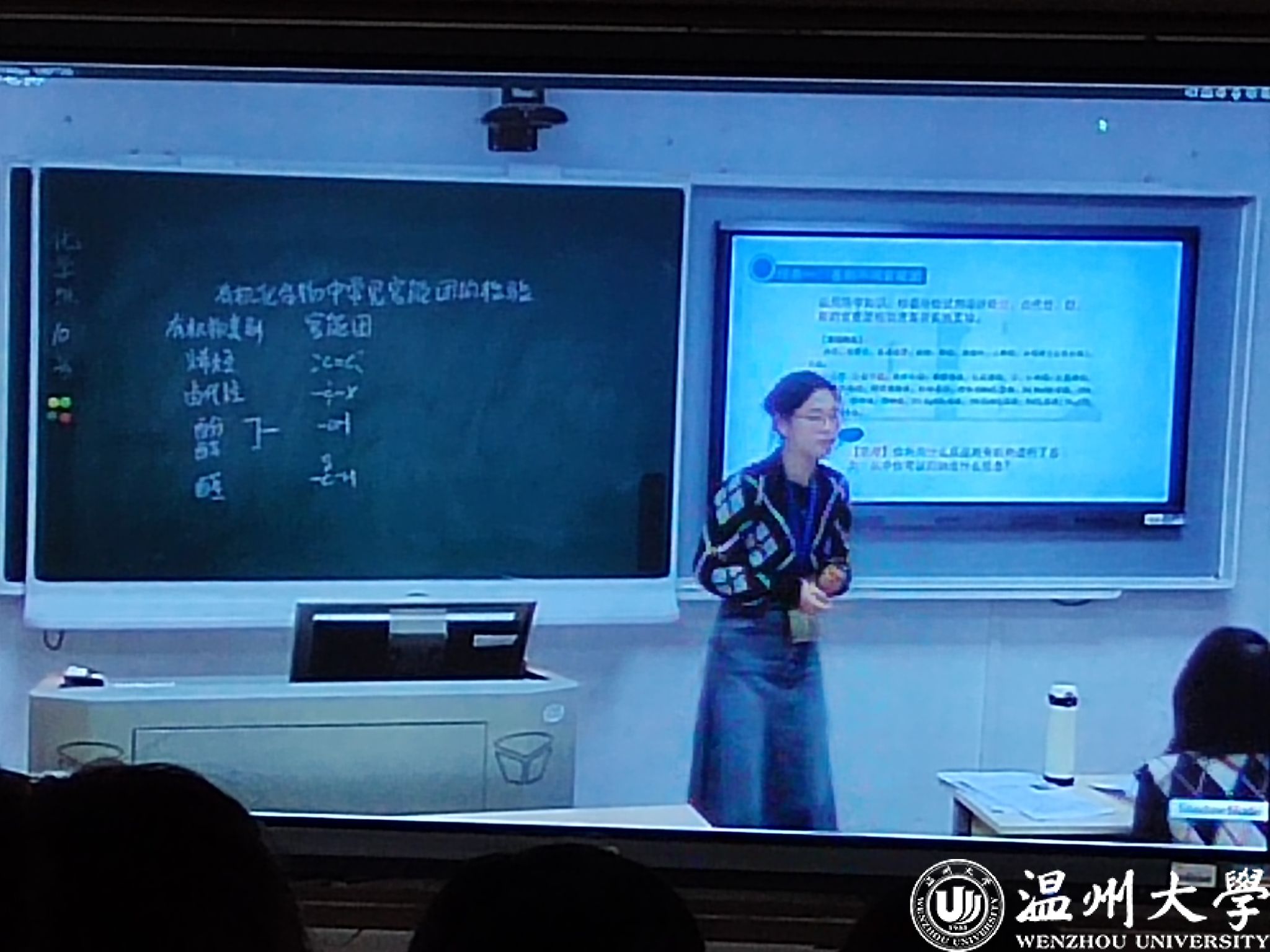 决赛现场,汉语言文学组臧航逸同学抽到的课题是《学习活动:词义的辨析与词语的使用》,区别于平时备赛所训练的课题,该题型较偏,难度较大,她随机应变,有机转化教学素材,灵活使用小组讨论法、自主探究法,轻松调度课堂,让学生在勾勒意象、命名画面与对比动词中体会“落木”所表现出的杜甫沉郁顿挫的语言风格,从而辨析“落木”的精深用法;化学组胡泱妮同学模拟上课题目是人教版高中化学选择性必修3第三章的实验活动2《有机化合物中常见官能团的检验》,她通过创设贴合生活的真实情境提出了启发性的问题——水果篮中为什么要放浸有高锰酸钾的硅藻土?以此引入教学并激发学生学习兴趣;历史组阮雨欣同学抽到了选择性必修2《经济与社会生活》的第5课《工业革命与工厂制度》,尽管时间短、任务重、教材内容不够熟悉,但她仍自信从容,以训练时打磨的框架为基础,快速准确地完成了ppt和教学设计,在授课过程中,她以狄更斯对工业时期的描述导入,营造认知冲突,以“学为中心”的理念设计学生活动,并通过问题链的形式构建学习支架,运用多样的教学方法帮助学生形成对工业时期全面、客观的历史认知,教学氛围热烈。