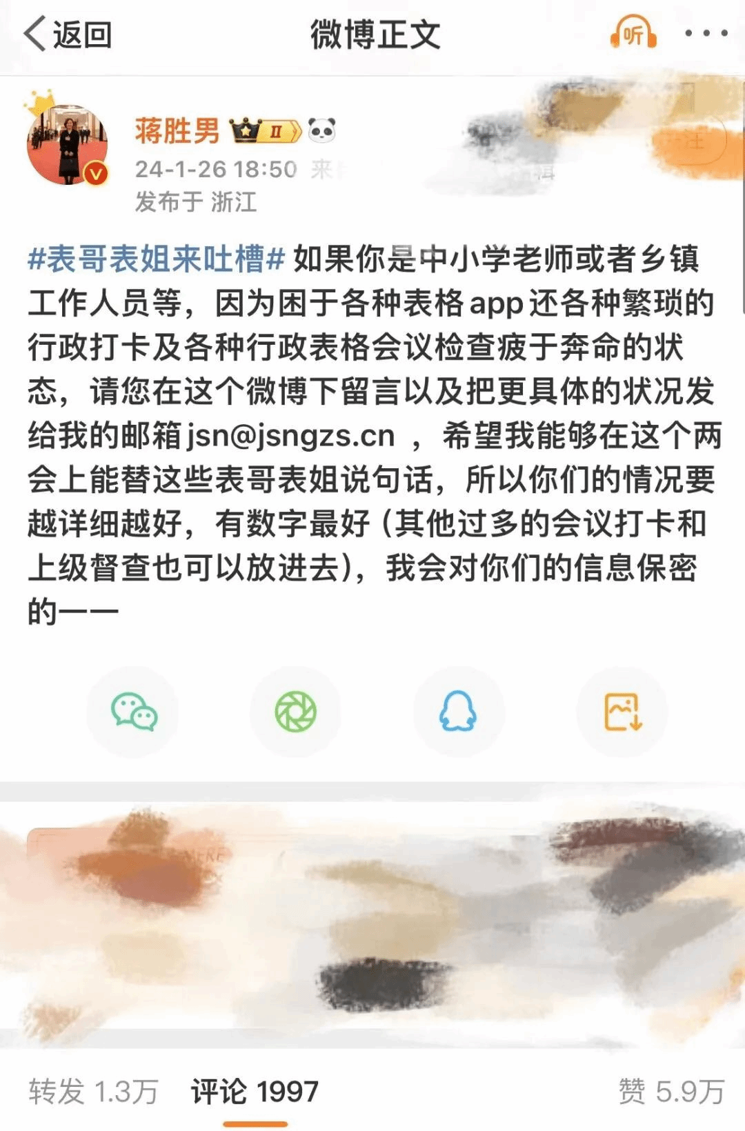 “蒋胜男发声反对加班泛滥”“蒋胜男建议减轻中小学教师行政压力”“委员蒋胜男呼吁为基层干部减负”“蒋胜男建议公务员考试取消35岁限制”……