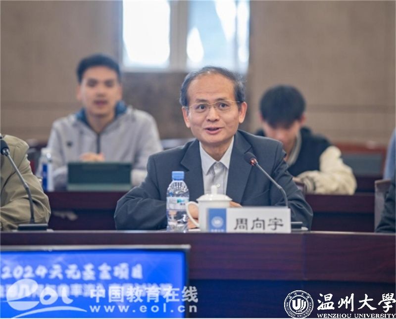周向宇院士致辞。他表示温州不仅是“数学家之乡”,更是“几何之乡”,温籍数学家姜立夫先生、苏步青先生、谷超豪先生等都在微分几何方面做出了重要贡献,在数学发展史上留下了浓墨重彩的一笔。他分享了苏步青先生春节依旧在图书馆钻研学术的小故事,激励在座一众年轻人要做到学习革命化,哪怕假期时间也要“放假不放下、放松不放空”,希望年轻一代薪火相传、守正创新,在探索学术的道路上不断进取,为建设“数学强国”贡献自己的力量。