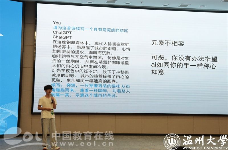 AI诗词环节也是精彩纷呈。选手们使用了诗三百、ChatGPT、讯飞星火、百度文库AI文档助手等AIGC工具辅助作诗。该赛道侧重表现AI作诗过程,选手通过AI视频、AI语音朗诵等多样的表现形式进行诗词展示。所有选手呈现完毕后,观众仍意犹未尽,于是主持人使用“文心一言”和“通义千问”两款AI工具,当场以“诗词大会”和“喜迎党代会”为主题作诗。不到5秒钟的时间,两首优美的七言绝句就呈现在观众面前,带领大家现场体验了一回AI作诗的快乐。最终陈彦霖同学在此环节拔得头筹,贾宝尔同学获得二等奖,周文茜同学夺得三等奖。