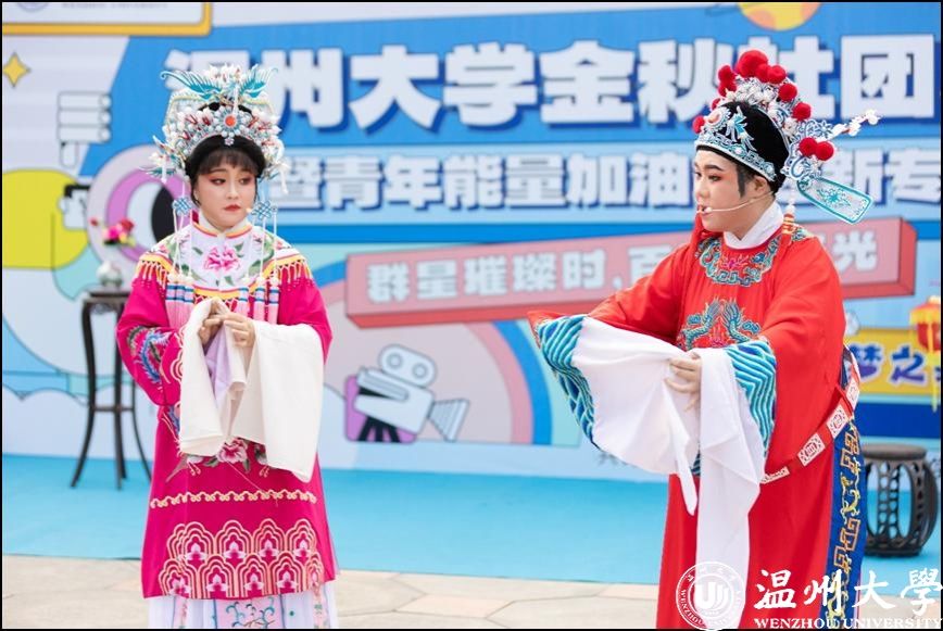 舞台区内,吉他协会、国标舞社等10余个学生社团带来的节目为现场的同学传递着青春的活力与能量,而由杏吧 红楼戏曲社、朗诵协会等学生社团带来的《打金枝》《红色的括苍山》等节目,则是让同学们沉浸式感受到中华优秀传统文化魅力及浙南浓厚的红色文化基因。