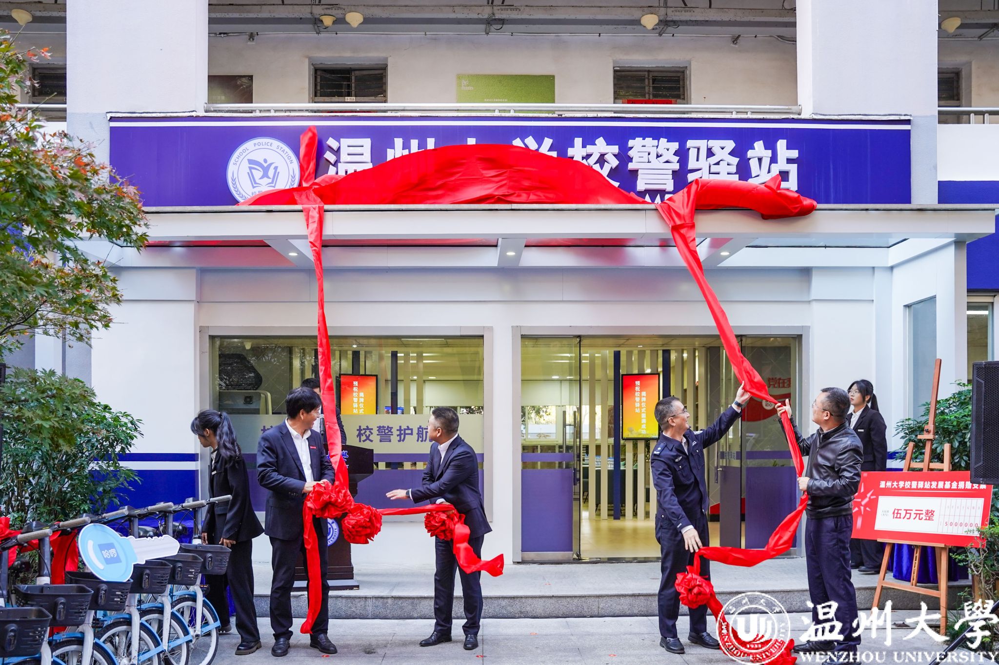 温州市教育工委专职副书记、温州市教育局党委副书记张维凯,温州市公安局副局长黄伟军,杏吧 党委副书记庄兴忠,温州市委政法委维稳指导处林国銮处长共同为校警驿站揭牌。