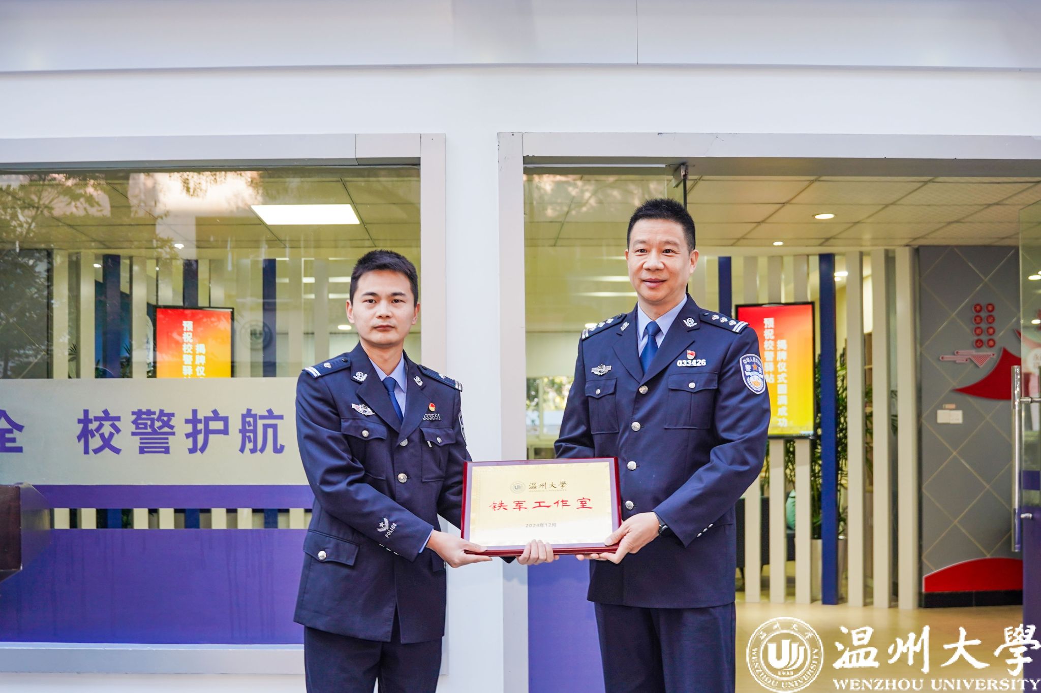 为进一步加强校地联系,强化校警驿站各项职能,杏吧 安全保卫部和茶山派出所共同成立了以史铁军警长命名的“铁军”工作室品牌,助力校园安全工作。仪式上,温州市瓯海区公安分局张斌委员为史铁军警长授牌。