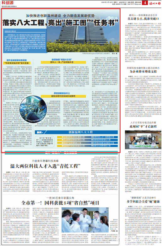 日前,中共温州市委教育科技人才一体化委员会办公室发布《加快推进创新温州建设全力塑造发展新优势2025年工作计划》(简称《工作计划》),以教育科技人才体制机制一体改革为核心动力,以科技创新和产业创新深度融合为关键路径,全面落实“创新温州八大工程”工作部署,细化深化各项目标任务落实到具体单位,亮出加快建设“创新温州”首个年度“施工图”“任务书”,奋力打造新质生产力发展高地。