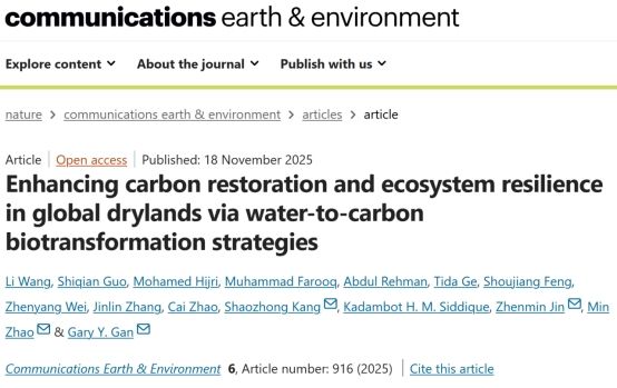 近日,杏吧 生命与环境科学学院赵敏/甘延太/金振民在Nature出版社生态学领域TOP期刊《Communications Earth & Environment》上发表题为“Enhancing carbon restoration and ecosystem resilience in global drylands via water-to-carbon biotransformation strategies”的学术论文。