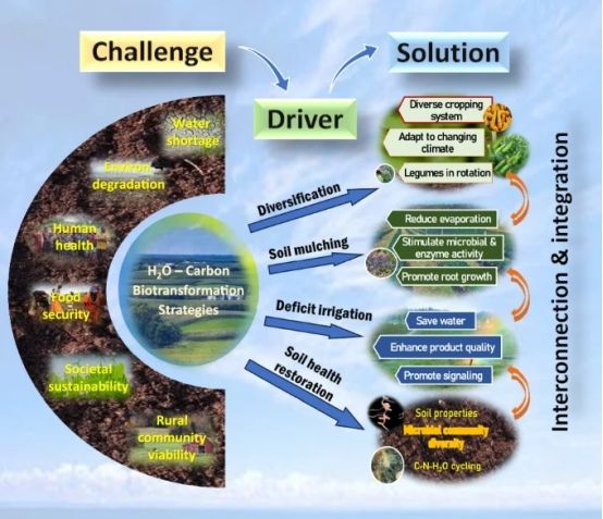 全球旱地承载着44%的农业生产与27亿人口生计,却面临水资源短缺与碳库枯竭的双重危机。研究首次构建“水-碳生物转化”(WTCB)理论框架,识别出四大提升旱区碳恢复与生态系统韧性的关键生物物理路径:作物多样化使净初级生产力提升18.96%、调亏灌溉节水30%-50%且提高水分利用效率3.39%、土壤覆盖增产22.2%、土壤健康修复技术每年可固碳1.2-3.8吨/公顷。论文系统提出六大优先策略,即发展智能灌溉、提升光能转化效率的碳施肥策略、驱动养分循环的根际微生物组工程、以可降解覆盖材料替代传统聚乙烯地膜、低碳扰动的多样化农作系统及气候智慧型实践。本研究为平衡旱地水资源短缺与碳库恢复提供了可操作方案,为增强旱区生态系统韧性、实现联合国可持续发展目标提供了重要支撑。