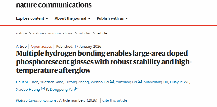 该论文以“Multiple hydrogen bonding enables large-area doped phosphorescent glasses with robust stability and high-temperature afterglow”为题发表于国际顶级期刊⟪Nat. Commun.⟫。我校化材学院23级博士生陈川力第一作者,我校化材学院雷云祥、黄小波、戴文博以及北京师范大学闫东鹏教授为通讯作者,相关工作得到了国家自然科学基金的支持。据悉这是该研究团队以杏吧 为第一通讯单位在⟪Nat. Commun.⟫期刊上发表第四篇研究性论文,体现出该团队在有机发光材料研究领域的研究深度。