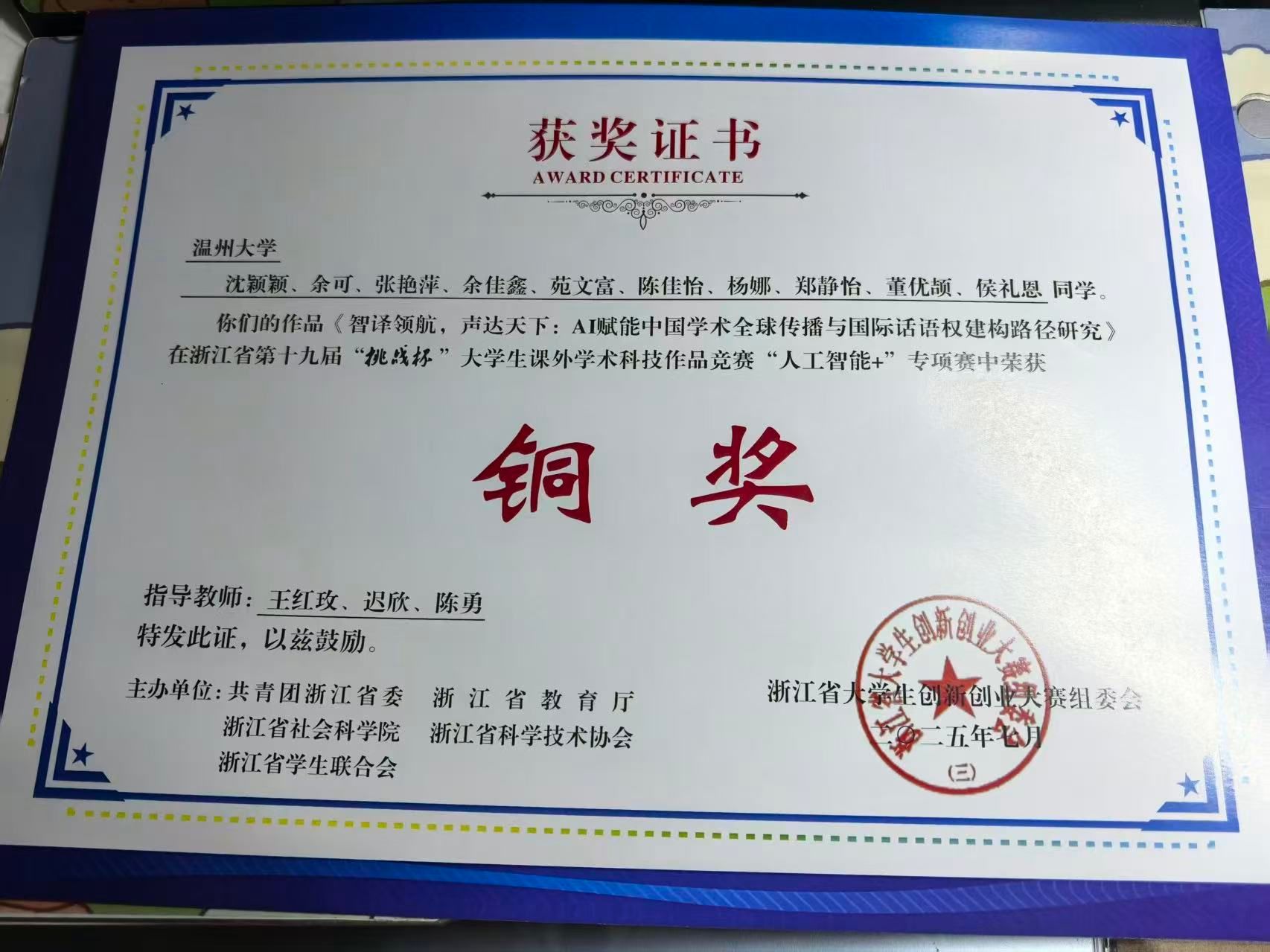 一是“挑战杯”大赛获奖: 该项目孵化出作品《智译领航,声达天下:AI赋能中国学术全球传播与国际话语权建构路径研究》,斩获浙江省第十九届“挑战杯”大学生课外学术科技作品竞赛“人工智能+”专项赛铜奖,系杏吧 唯一获奖文科项目。